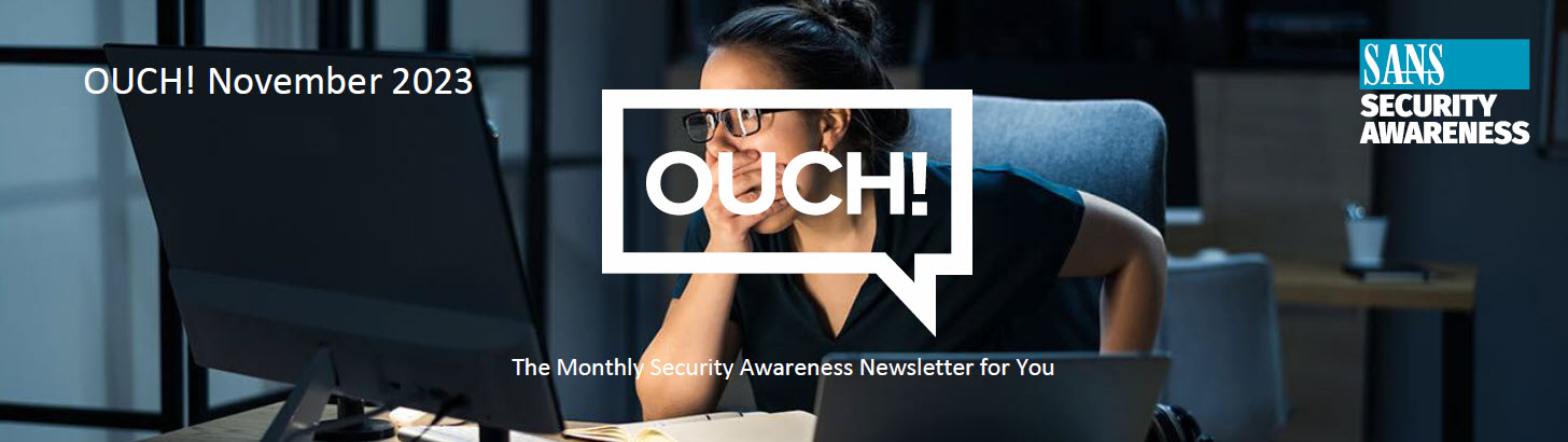 OUCH Security Awareness newsletter is published monthly and has an entire series on how to secure yourself. In the Resources section below, we list the most important OUCH newsletters to read to protect yourself. These resources focus on three key steps: